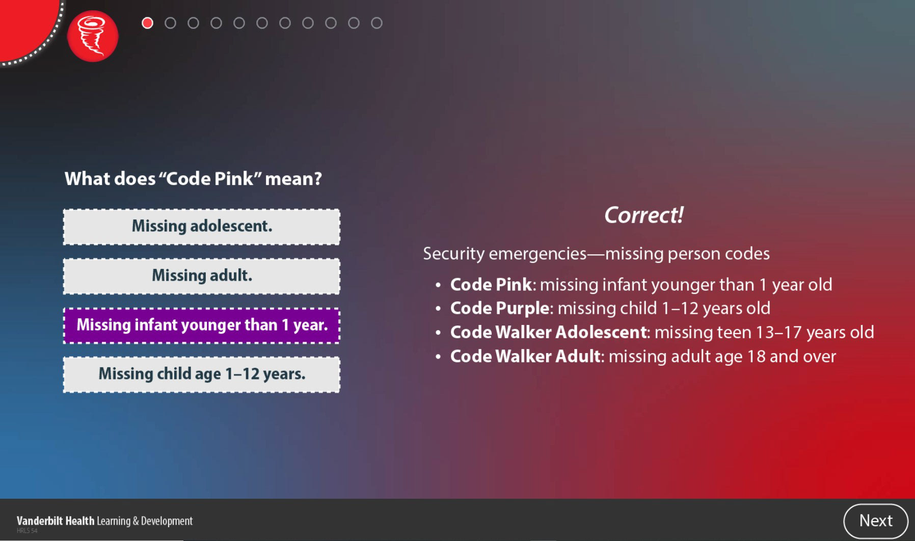 Sampling of screen shots from annual training course containing topics on employee health, safety, emergency preparedness, active shooter training, HIPAA compliance, etc. Course was delivered via Absorb Learning Management System to 30,000+ employees. Quiz slides were scored and employees were marked complete in the company compliance portal after correctly answering all questions.